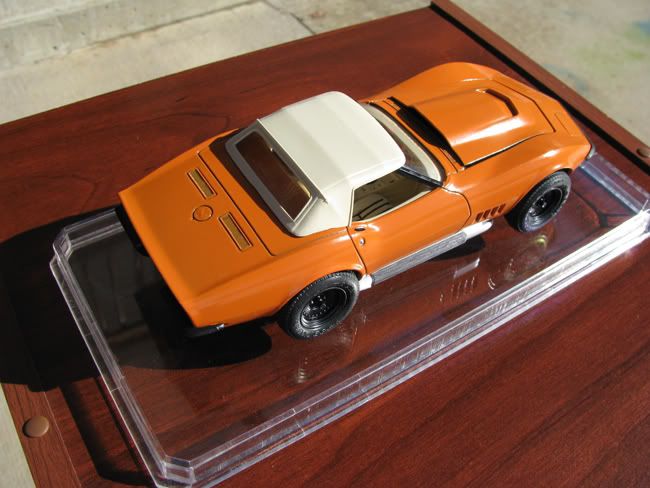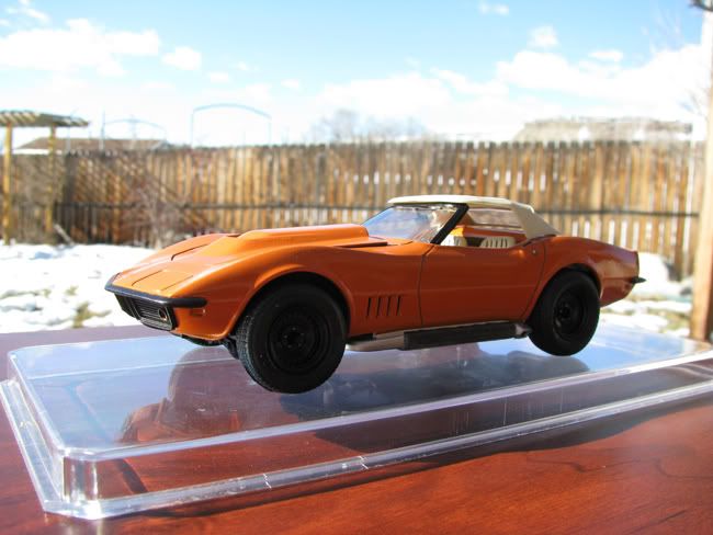 Its the Revell '68 Corvette Roadster 2 in 1. I got this kit from my mom for Christmas of 1999 when I lived in Japan. She sent me 3 or 4 muscle car kits, and initially I had painted it red with white trim. Unfortunately the red ran, and so the kit got shelved till last year. I picked it back up, gave it a Purple Power bath, and some light sanding, and dove back in..